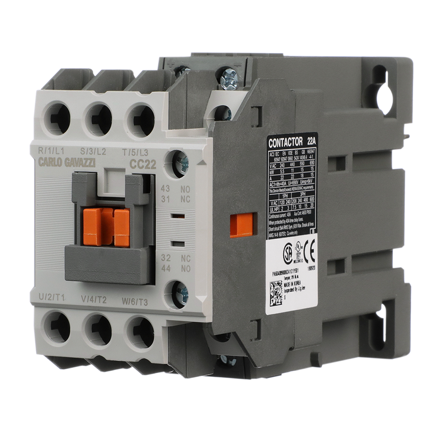 IEC Magnetic Contactor: Non-Reversing, 3 Poles, 12 A, Coil: 110 VAC 50/60 Hz, Auxiliary Contacts: 1 Normally Open (NO), 1 Normally Closed (NC)Spécifications